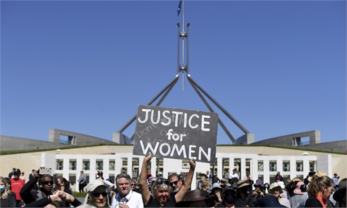 Tens of thousands of women gathered outside Australia's parliament and towns and cities across the country on Monday ...