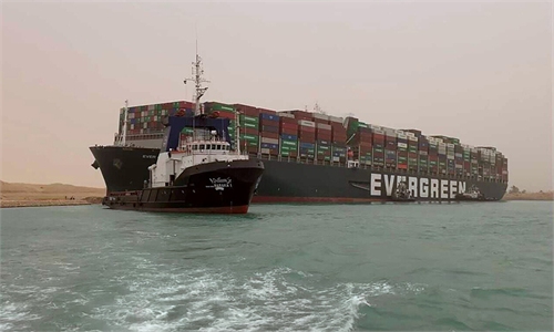 It is now blocking transit in both directions through one of the world's busiest shipping channels for goods, oil, grain and other products linking Asia and Europe.
