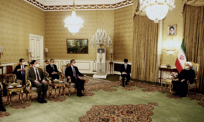 Iranian President Hassan Rouhani (1st R) meets with Chinese State Councilor and Foreign Minister Wang Yi (4th L) in Tehran, Iran, on March 27, 2021.(Photo: Xinhua)