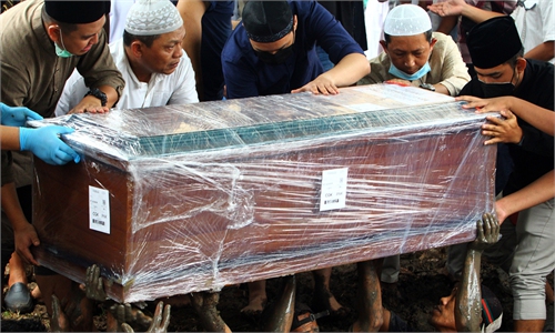 Members of of National Transportation Safety Committee carry a box containing the cockpit voice recorder of Sriwijaya Air flight SJ-182 recently retrieved from the waters off Java Island where the passenger jet crashed in January, during a press conference at Tanjung Priok Port in Jakarta, Indonesia, on March 31. Photo: VCG