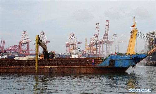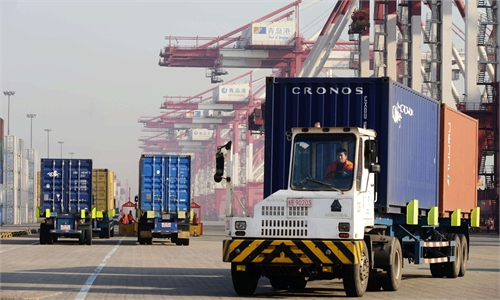 A container ship waits to depart from the Jintang Dapukou container terminal of Ningbo Zhoushan Port in Ningbo, East China's Zhejiang Province, on Thursday. The container terminal has witnessed cargo throughput of 392,300 twenty-foot equivalent units (TEUs) in the first quarter of 2021, up 23 percent year-on-year, customs data showed. Photo: cnsphoto