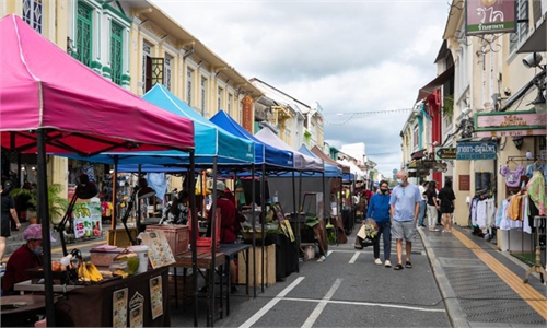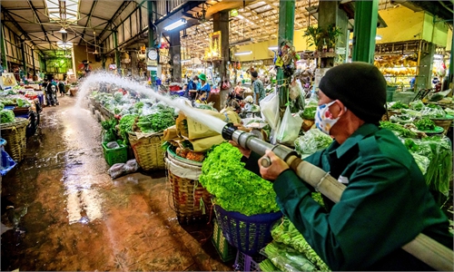 A travel agency employee sits in front of his closed shop while covered vans for tourist transport are parked along an alley in Bangkok, Thailand, on Thursday. The country is considering closing entertainment venues in Bangkok and 40 provinces for the coming Song Kran holiday. Photo: AFP