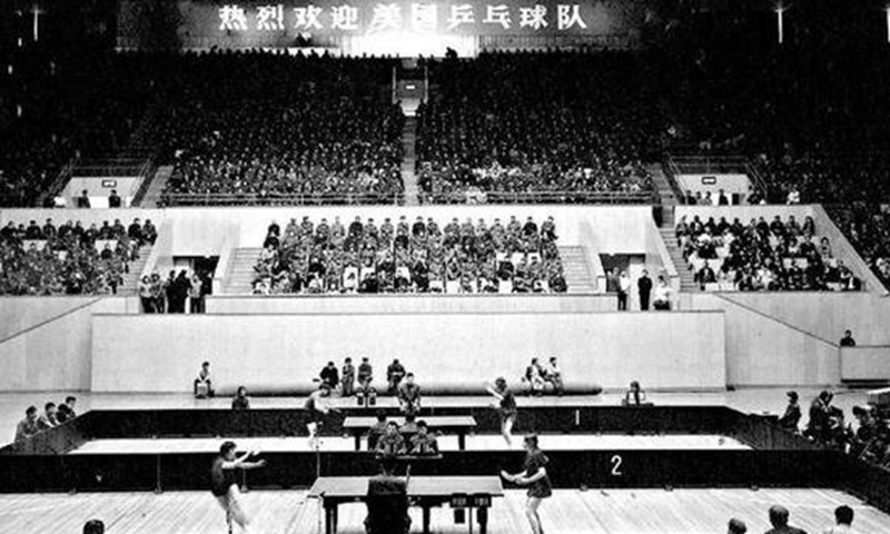 A ceremony is held to welcome the American delegation at the Capital Gymnasium in Beijing, where Chinese and American athletes played a friendly match on April 13, 1971. File photo: Xinhua