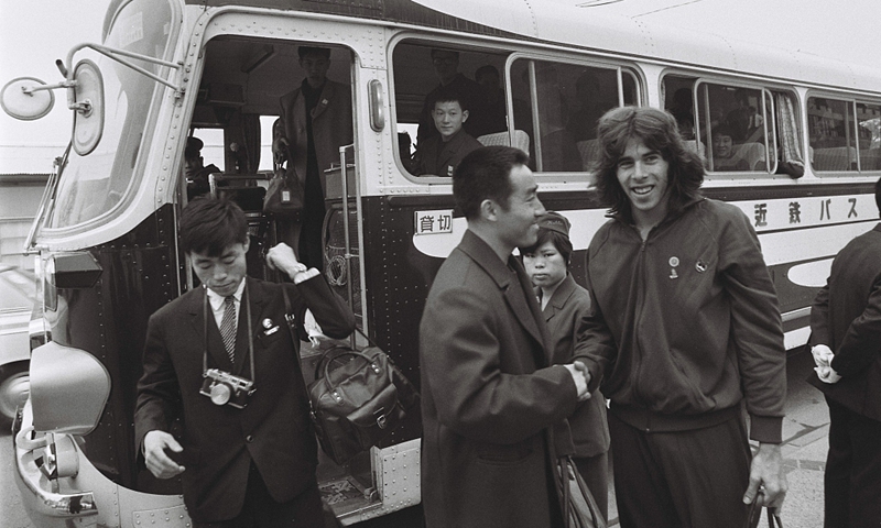 American player Glenn Cowan (right) shakes hands with Chinese player Zhuang Zedong (center) after getting off a bus for Chinese players during the 31st World Table Tennis Championships on April 4, 1971 in Nagoya, Japan. Glenn Cowan, who missed a bus for his own team, accidentally boarded a bus for Chinese players, which led to a domino series of events that eventually saw the establishment of diplomatic relationship between China and the US. File photo: VCG
