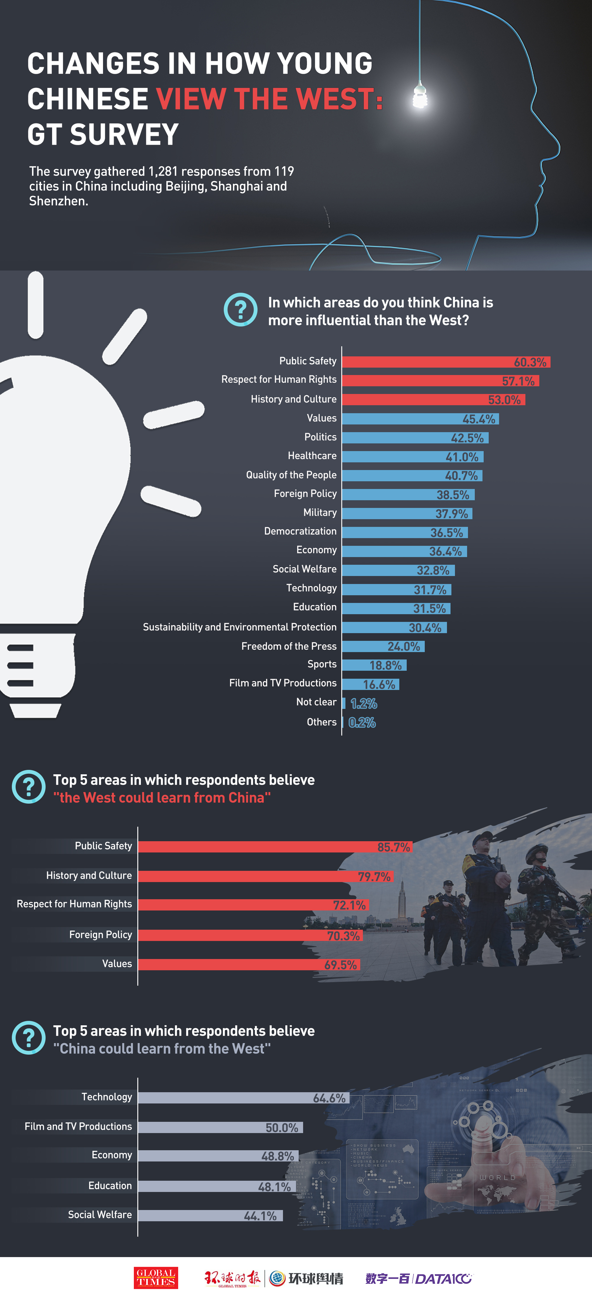 Approximately 90 percent of the young Chinese participating in the latest survey conducted by the Global Times Research Center believe China should not "look up to the West" anymore, with more people in the past five years even "looking down on the West" due to multiple reasons including China's achievements in its development and the West's failed handling of the COVID-19 pandemic.