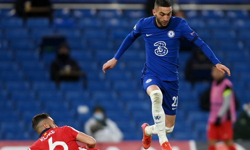 Chelsea's Reece James (front) duels for the ball with Brighton's Dan Burn on Tuesday in London, England. Photo: VCG