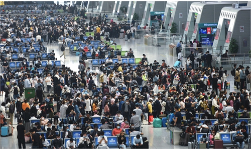 The country's railway systems are estimated to make 18.3 million passenger journeys on Saturday, up 6.1 percent compared with the same period in 2019, according to data China Railway sent to the Global Times.