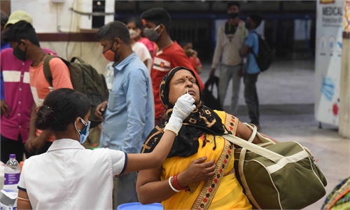 Passengers stand in a queue at a ticket counter to board buses for their native place, after authorities announced 14 Days lockdown , amid surge in coronavirus cases across the country, at Sindhi camp bus stand in Jaipur , Rajasthan, India, on Sunday. Photo: VCG