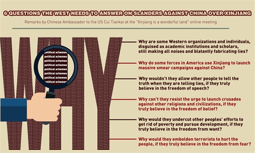 Hua noted that the US' attempt to gang up with Britain and Germany to use the UN's venues to hype Xinjiang-related topics reminds people of a similar farce staged by the former US representative to the UN Kelly Craft. In January, Craft abused her power to sneak into the UN Hall and have her talks with some students from the Taiwan island recorded.