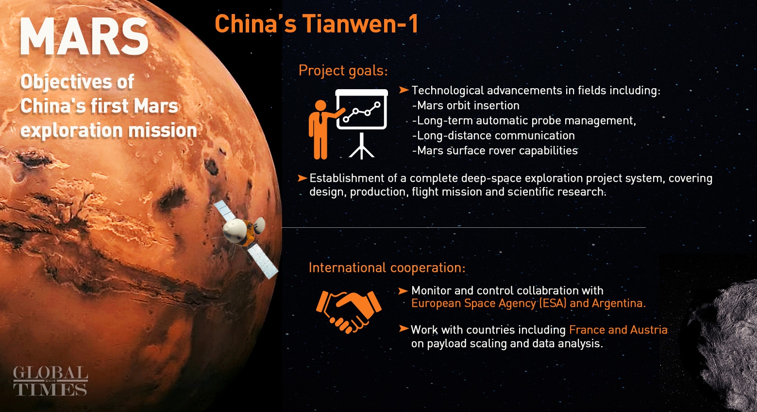 Wang expressed confidence in the Chinese craft's ability to carry out the breathtaking moment. "The automatic touchdown technology on an extraterrestrial body has been fully verified in previous missions to the Moon, with the latest Chang'e-5 lunar probe soft landing turning out to be a complete success."