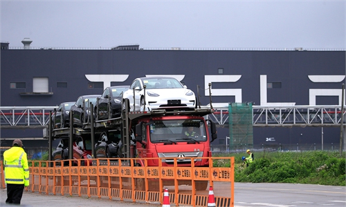 Photo taken on Oct. 19, 2020 shows the Tesla China-made Model 3 vehicles which will be exported to Europe at Waigaoqiao port in Shanghai, east China, Oct. 19, 2020. (Xinhua/Wang Xiang)