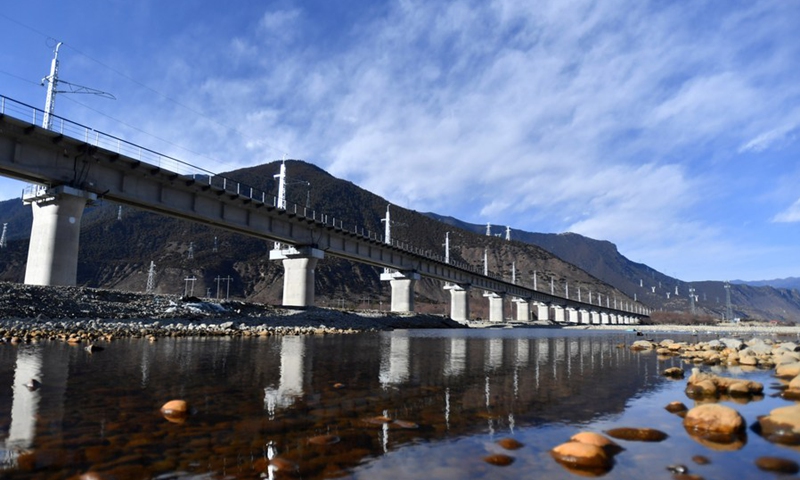 Photo taken on December 27, 2020 shows a bridge of Lhasa-Nyingchi section of the Sichuan-Tibet Railway in Southwest China's Tibet Autonomous Region. Photo: Xinhua