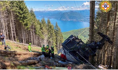 People leave a cableway building at its starting point by Lake Maggiore in Stresa on the shores of Lake Maggiore in the Piedmont region, Italy, on Monday, a day after a cable car accident killed 14 people in Stresa. The cause of the incident remains unclear, but local reports suggest the cable may have failed about 300 meters from the top of the mountain. The cabin fell about 20 meters to the ground and rolled down the slope before being stopped by trees. Photo: AFP