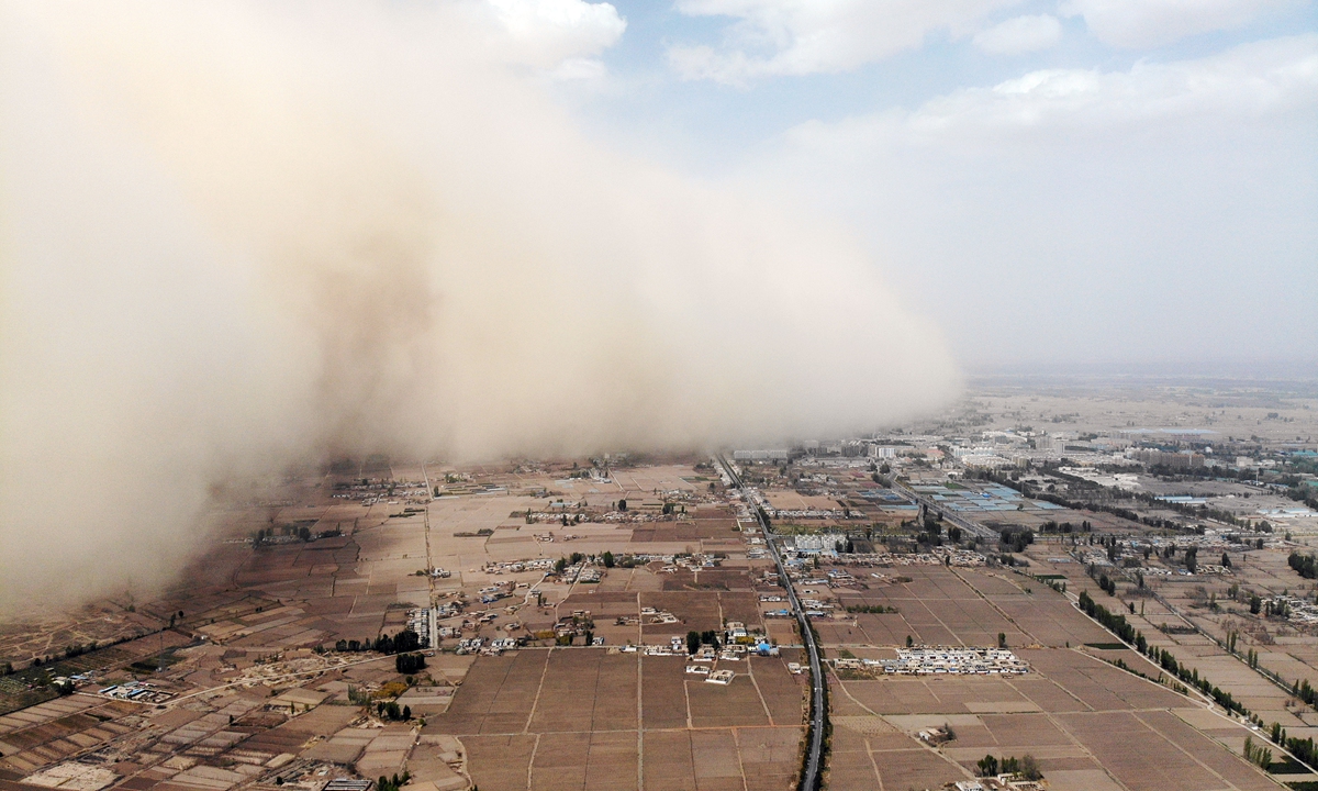 A "wall" of dust rolls forward in Linze county, Northwest China's Gansu Province as a sandstorm hits the county on Sunday. According to the Gansu meteorological authorities on the same day, many other locations in the province would soon experience gales of varying degrees, accompanied by sandstorms. Photo: cnsphoto