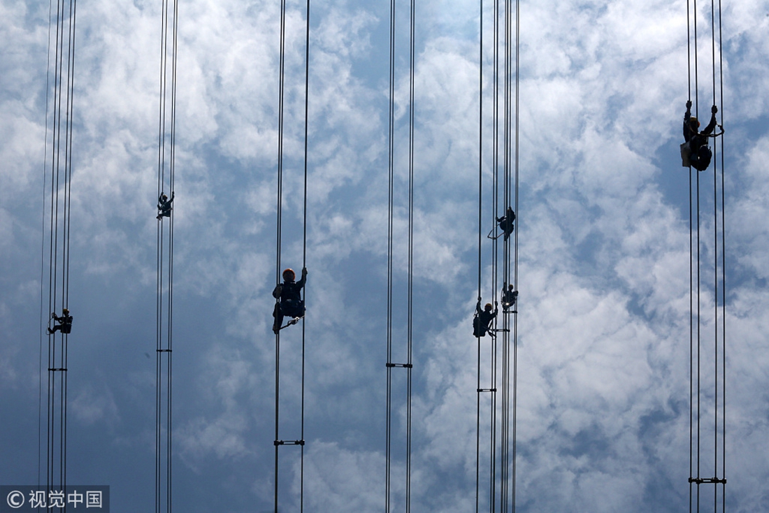 Electricians from China Southern Power Grid in Dongguan, Guangdong Province, check the high voltage cables hanging about 50 meters in the air on May 29, 2018. Photo: VCG