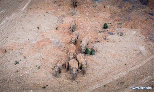 Aerial photo taken on May 28, 2021 shows a herd of wild Asian elephants in Eshan County, Yuxi City, southwest China's Yunnan Province. Authorities are tracking 15 wild Asian elephants in southwest China's Yunnan Province as the herd migrates northward. The elephants are now wandering in the county of Eshan, following a long journey from the province's southmost prefecture starting from April 16.(Photo: Xinhua)