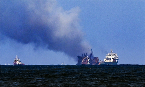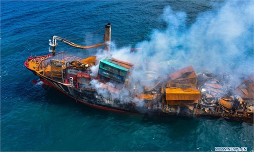 Photo taken on June 2, 2021 shows part of the X Press Pearl, a container ship burnt near the Colombo Port, in Colombo, Sri Lanka. The Sri Lankan Navy on Wednesday said that operations to tow the burnt X Press Pearl ship had been halted after the rear end of the vessel had hit the sea bed.(Photo: Xinhua)