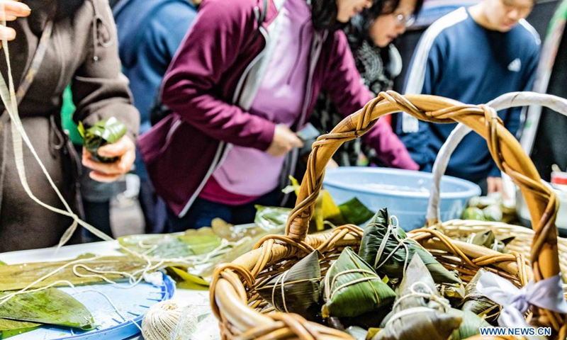People make zongzi to celebrate the Dragon Boat Festival in Canberra, Australia, on June 6, 2021. Zongzi is a traditional Chinese delicacy made of rice and stuffing wrapped in reed or bamboo leaves, usually consumed on the occasion of Dragon Boat Festival, which falls on June 14 this year.(Photo: Xinhua)