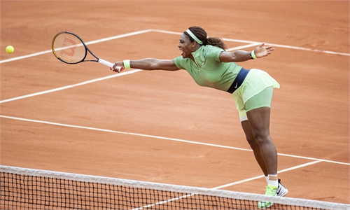 Serena Williams hits a forehand against Elena Rybakina at the French Open on Sunday in Paris. Photo: VCG