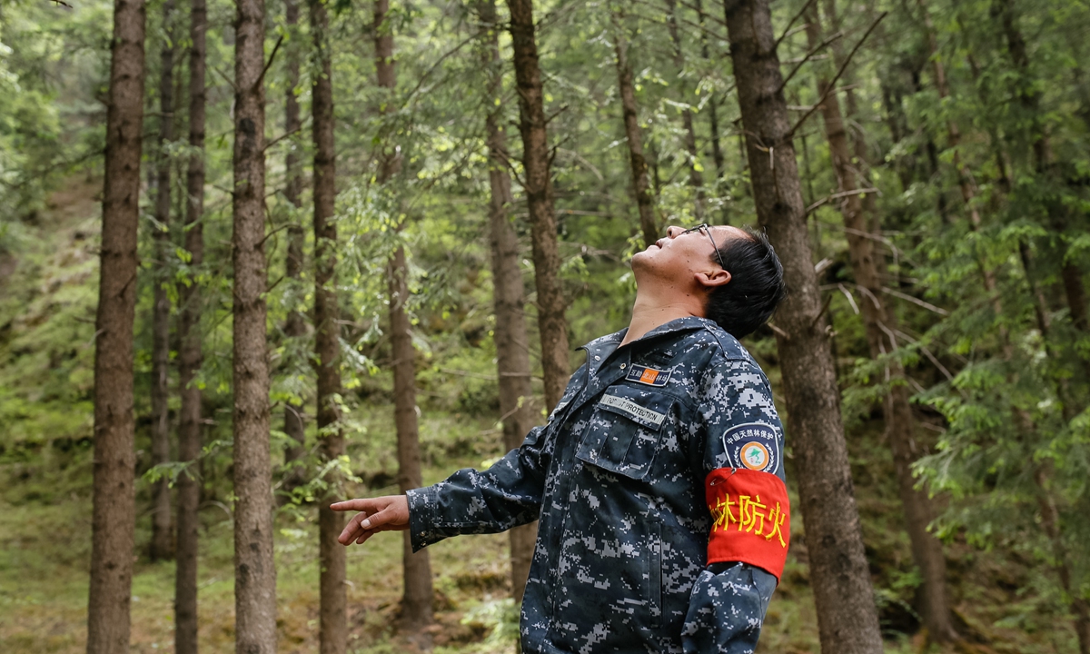 Liu Zhilong, a forest guard at the Beishan Forest Farm, looks up, checking for signs of pests on the trunks and leaves of a tree. Photo: Shan Jie/GT