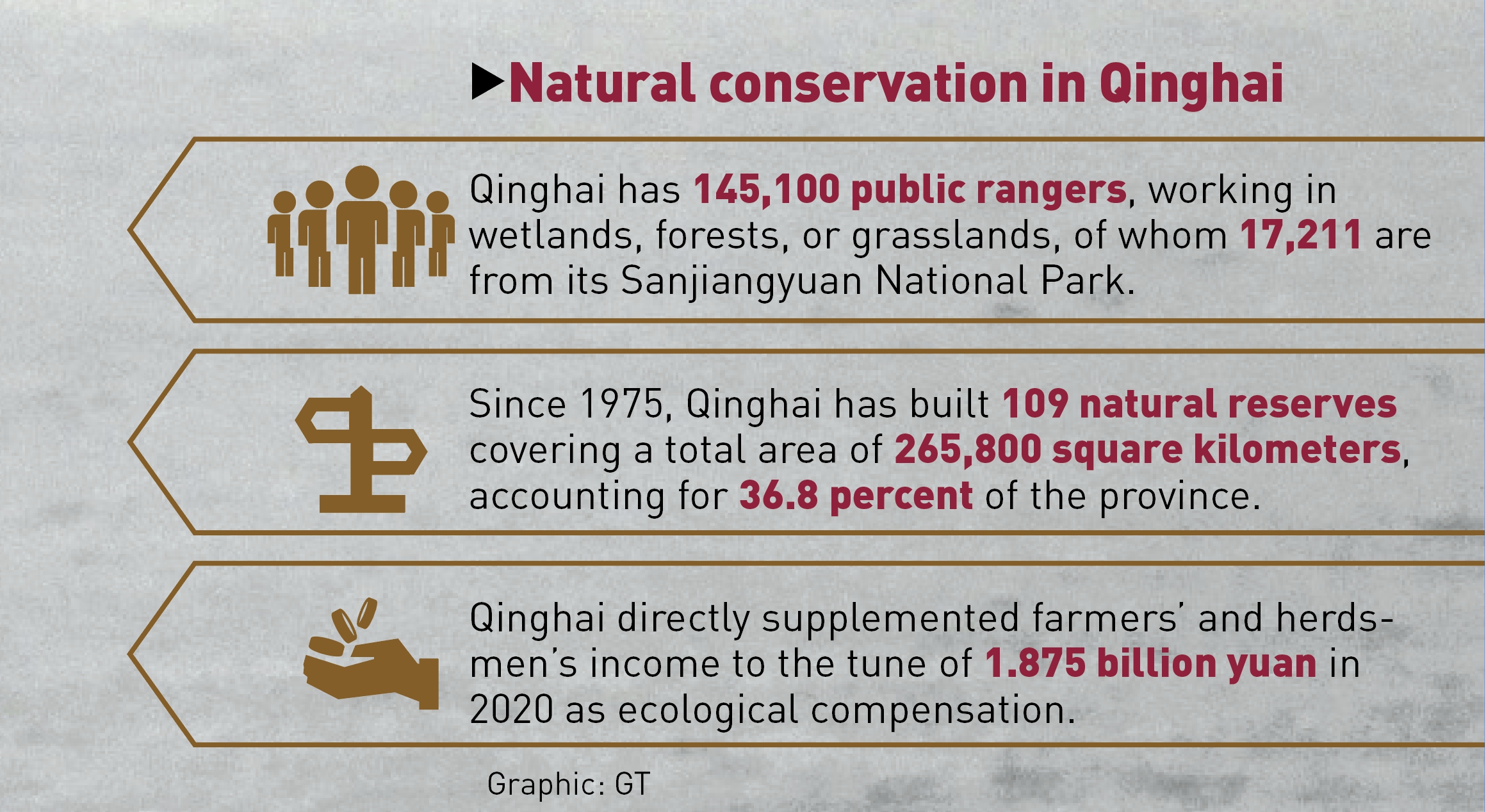 Qinghai has engineered a public ranger system, with 145,100 people joining, working in wetlands, forests, or grasslands, of which 17,211 are from its Sanjiangyuan National Park, the origins of the Yangtze River, the Yellow River, and the Lancang (Mekong) River.