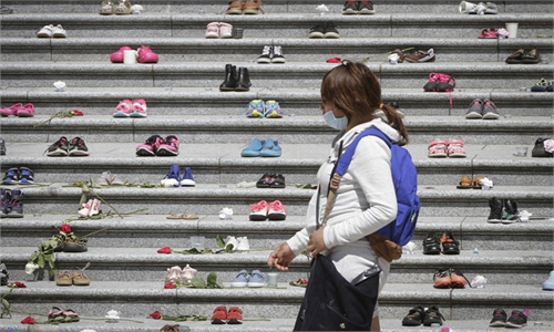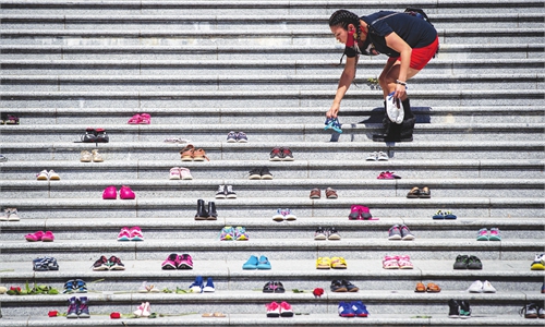 Children's shoes, dolls, flowers with notes at the front of Legislative Assembly of Ontario, Canada, to commemorate the deaths of 215 Indigenous children whose remains were found in a former residential school in Kamloops city in the country, June 2, 2021. Photo:China News Service