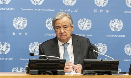 UN Secretary General Antonio Guterres attends a press conference at the end of a 5+1 Meeting on Cyprus on April 29, 2021. Photo: VCG