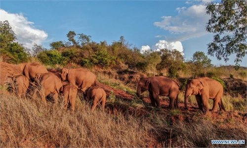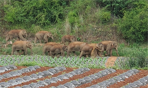 Aerial photo taken on June 6, 2021 shows wild Asian elephants in Jinning District of Kunming, southwest China's Yunnan Province. A herd of wild Asian elephants have made a temporary stop along their migration in the outskirts of the southwestern Chinese city of Kunming, authorities said Monday. Of the 15 elephants, one male has broken free from the herd and is currently about 4 km to the northeast of the group, according to the on-site command tracking the elephants.(Photo: Xinhua)