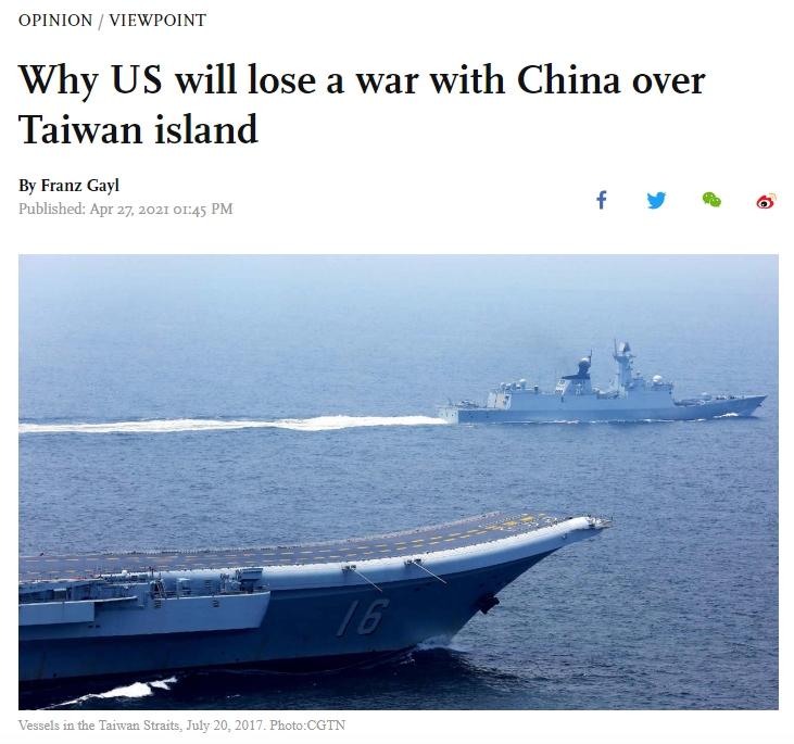 Gayl further delivered his stance in another article a month later, in which he made it clear that "Attempting to support the renegade island of Taiwan's secession is directly contrary to the US national interest as we know in advance we will lose."