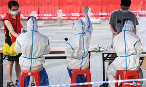 People have their information registered before COVID-19 nucleic acid testing in Liwan District of Guangzhou, south China's Guangdong Province, June 8, 2021. A new round of mass testing in high-risk areas of Baihedong Street and Zhongnan Street in Guangzhou started on Tuesday.(Photo: Xinhua)