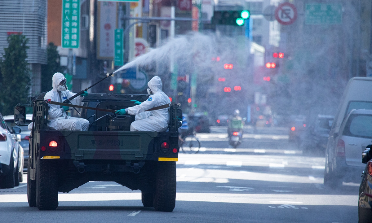 Disinfection workers sanitize the streets in Taipei on the island of Taiwan on Sunday amid mounting COVID-19 epidemic control pressure, as the island registered 335 cases on Monday following 207 the previous day. Photo: VCG