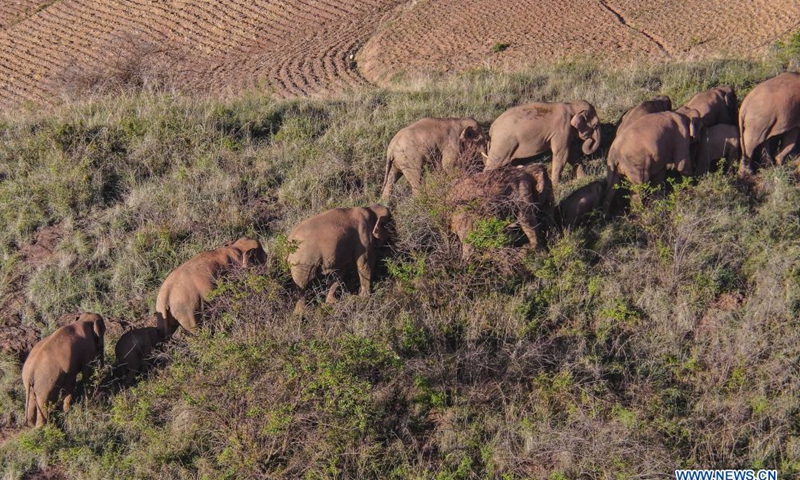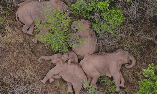 Aerial photo taken on June 19, 2021 shows a herd of wild Asian elephants in Dalongtan Township of Eshan County, Yuxi City, southwest China's Yunnan Province. From June 18 to June 19, China's famous herd of wandering elephants has headed 3.09 km southwest and continued to linger in Dalongtan Township of Eshan County. (Photo:Xinhua)