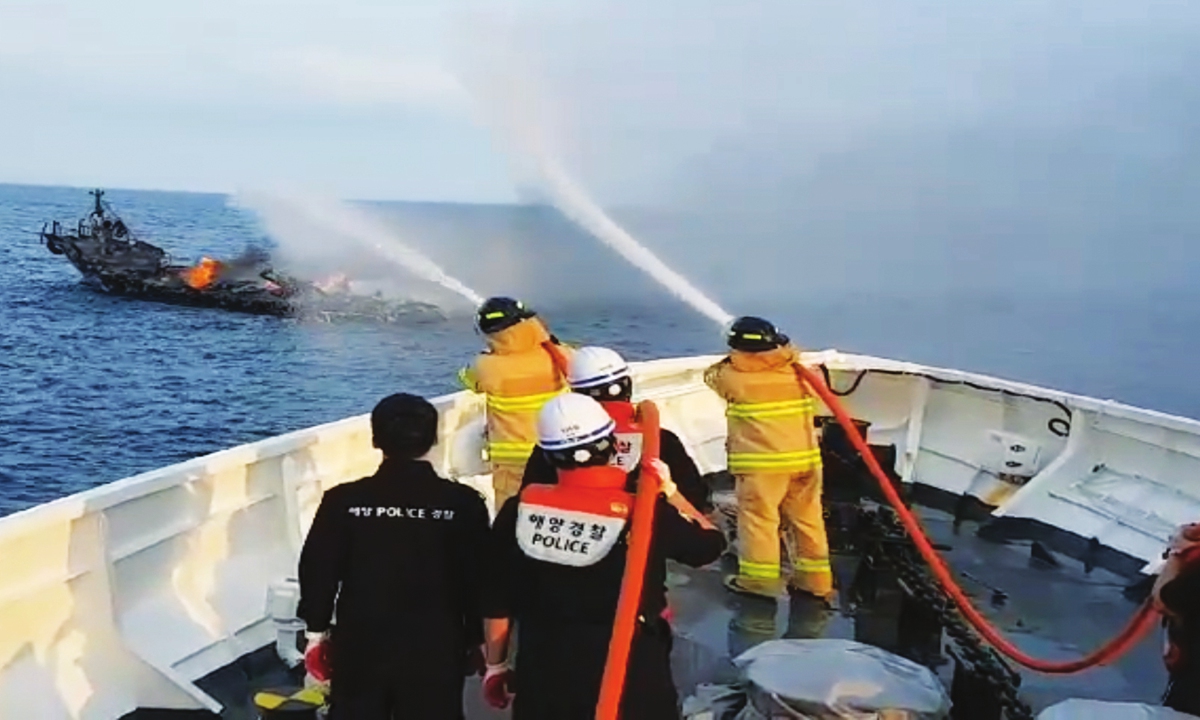The coast guard put out the fire on the garrison ship after a fishing boat caught fire on Thursday in the sea 8.3 kilometers northeast of Niusdo in Jeju, South Korea. Photo: VCG