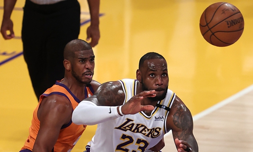Devin Booker of the Phoenix Suns drives to the basket against the Los Angeles Clippers on Saturday in Los Angeles. Photo: VCG