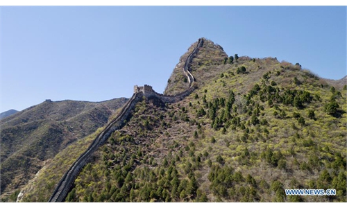 huqin (a traditional Chinese stringed instrument) player, and 19 students aged from 8 to 15 dressed in white shirts and blue pants or dresses, climbed to the Jiatianyu section of the Great Wall in Huairou District in Beijing, and played the song on the