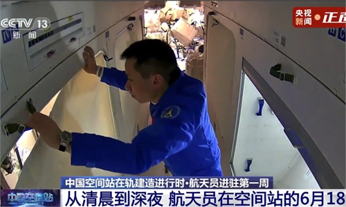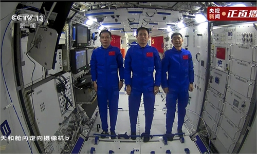 Standing in front of a Chinese national flag and a flag of the Communist Party of China (CPC), the first crew of taikonauts stationed in China's space station's Tianhe core module sent their "heavenly blessings" on Tuesday for the upcoming centennial of the CPC, which falls on Thursday.