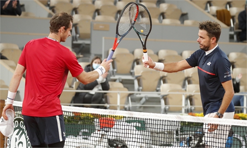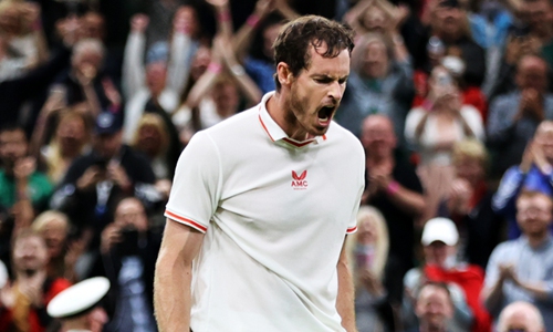 Andy Murray celebrates in the match against Oscar Otte at Wimbledon on Wednesday. Photo: VCG