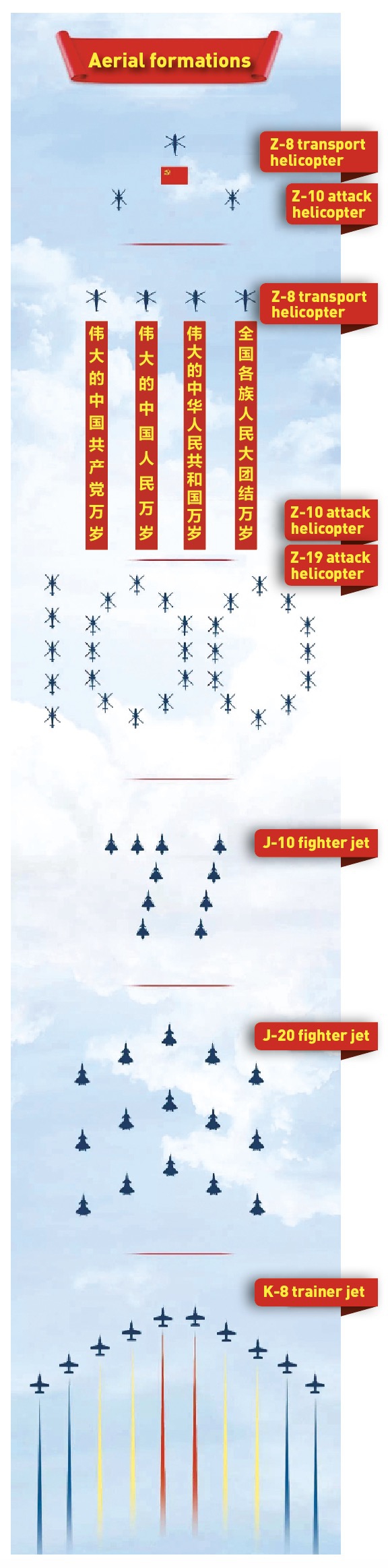 Seventy-one top Chinese military aircraft join the celebration by delivering an aerial performance over Tian'anmen Square. Graphic: China Central Television