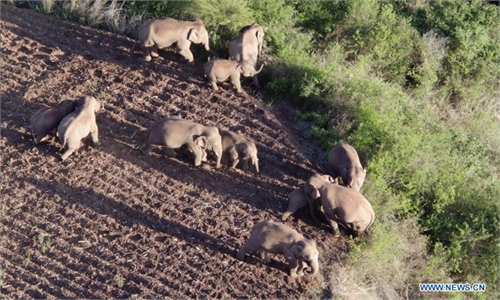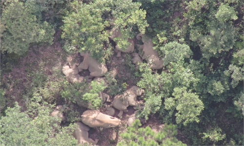 Screen grab from drone video shows the Asian elephants in Eshan County of Yuxi, southwest China's Yunnan Province on June 20, 2021.(Photo: Xinhua)