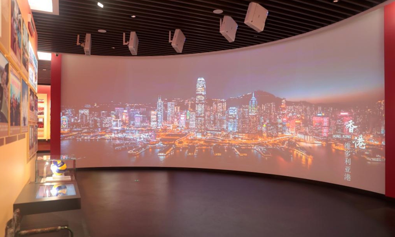 Photo taken on June 28, 2021 shows the hall under the theme about guardians of Hong Kong at the exhibition center of the Chinese People's Liberation Army (PLA) Garrison in the Hong Kong Special Administrative Region (HKSAR) in Hong Kong, south China.Photo:Xinhua
