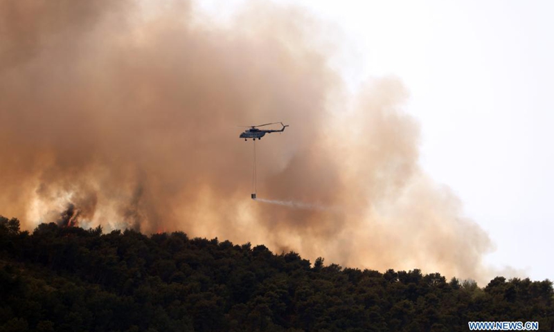 A firefighting helicopter pours water on a forest fire on the Island of Ciovo in Croatia, on July 10, 2021(Photo: Xinhua)
