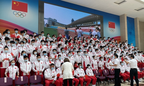 Representatives of the Chinese delegation for the Tokyo Olympics attend a meeting in Beijing on Wednesday. The delegation, including 298 female athletes and 133 male athletes, will compete in 225 events at the Games, which are scheduled to open on July 23. Photo: Xinhua