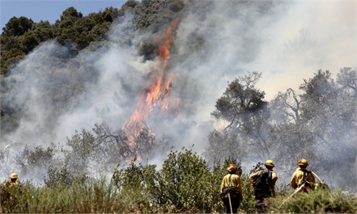 This handout photo courtesy of BC Wildfire Service shows the plume of smoke from wildfire C31056, near McKinley Lake and about 35 kilometers east of Horsefly, British Columbia, Canada on Wednesday. Multiple fires have broken out in British Columbia and evacuation orders have been issued for the village of Lytton, which has set a new temperature record by reaching 49.5 C in recent days. Photo: AFP
