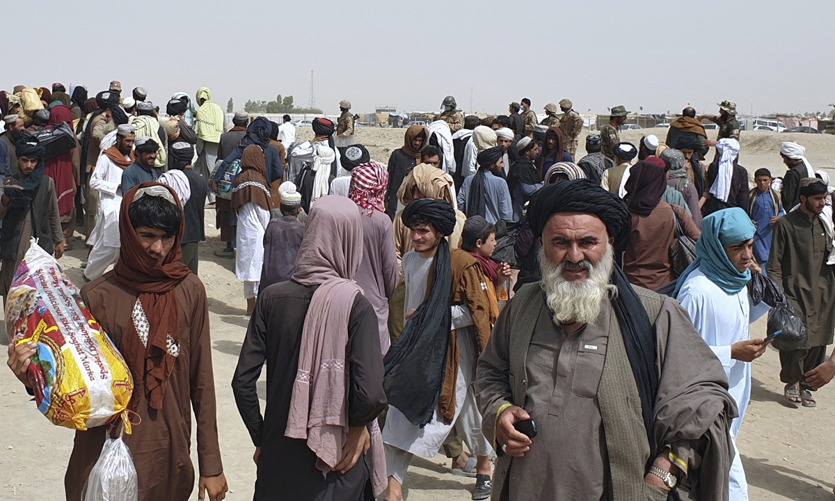 Pakistani soldiers guard as stranded people gather near the Pakistan-Afghanistan border crossing following fighting between Afghan security forces and the Taliban in Pakistan on Friday. Photo: AP