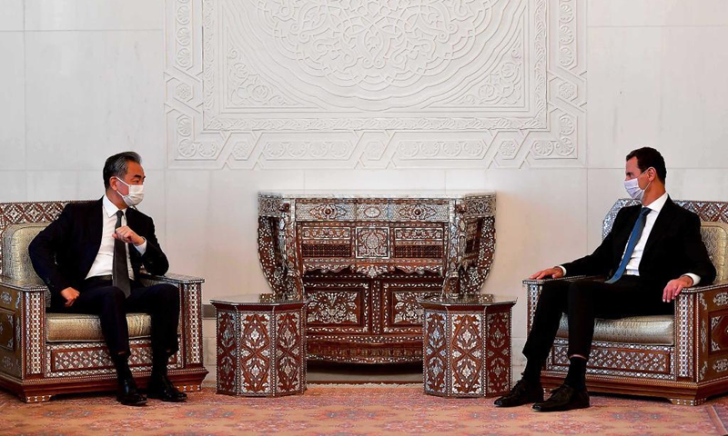 Syrian President Bashar al-Assad (R) meets with visiting Chinese State Councilor and Foreign Minister Wang Yi in Damascus, Syria, on July 17, 2021. China opposes any attempt to seek regime change in Syria and will boost the mutually beneficial cooperation with Syria for the benefit of the two peoples, Wang Yi said on Saturday. Photo:Xinhua