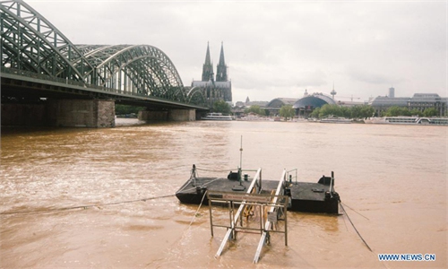 Flooded bank of the Rhine river is seen in Cologne, western Germany, July 15, 2021. Photo:Xinhua