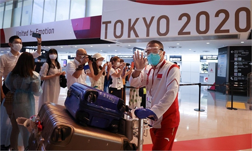 Jia Xiuquan, head coach of the Chinese women's national football team, arrives at the Narita airport in Tokyo, Japan, July 17, 2021. Some members of the Chinese Olympic delegation arrived in Tokyo on Saturday.(Photo: Xinhua)
