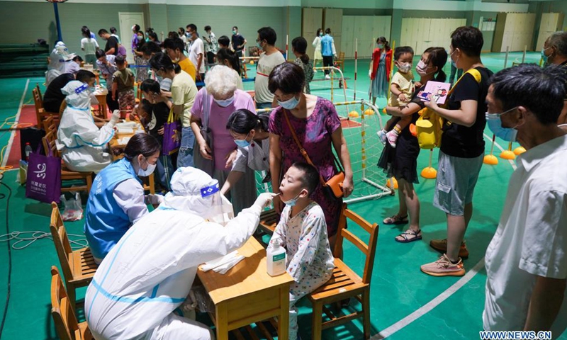 Medical workers take swab samples from residents for COVID-19 test at a testing site in Nanjing, east China's Jiangsu Province, July 21, 2021. Nanjing, which has a population of more than 9.3 million, carried out citywide nucleic acid testing starting on Wednesday.(Photo: Xinhua)