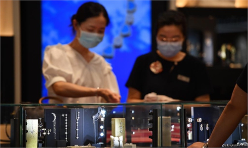 Customers choose products at a duty-free shopping mall in Haikou, south China's Hainan Province, July 2, 2021. Official data shows that offshore duty-free sales in the province grew 226 percent between July 1, 2020 and June 30, 2021, reaching 46.8 billion yuan (about 7.2 billion U.S. dollars). Meanwhile, about 60.72 million items were sold to some 6.28 million customers. Photo:Xinhua