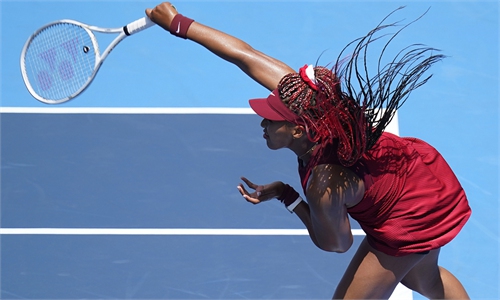 Naomi Osaka of Japan serves against Marketa Vondrousova of the Czech Republic on Tuesday in Tokyo. Photo: VCG